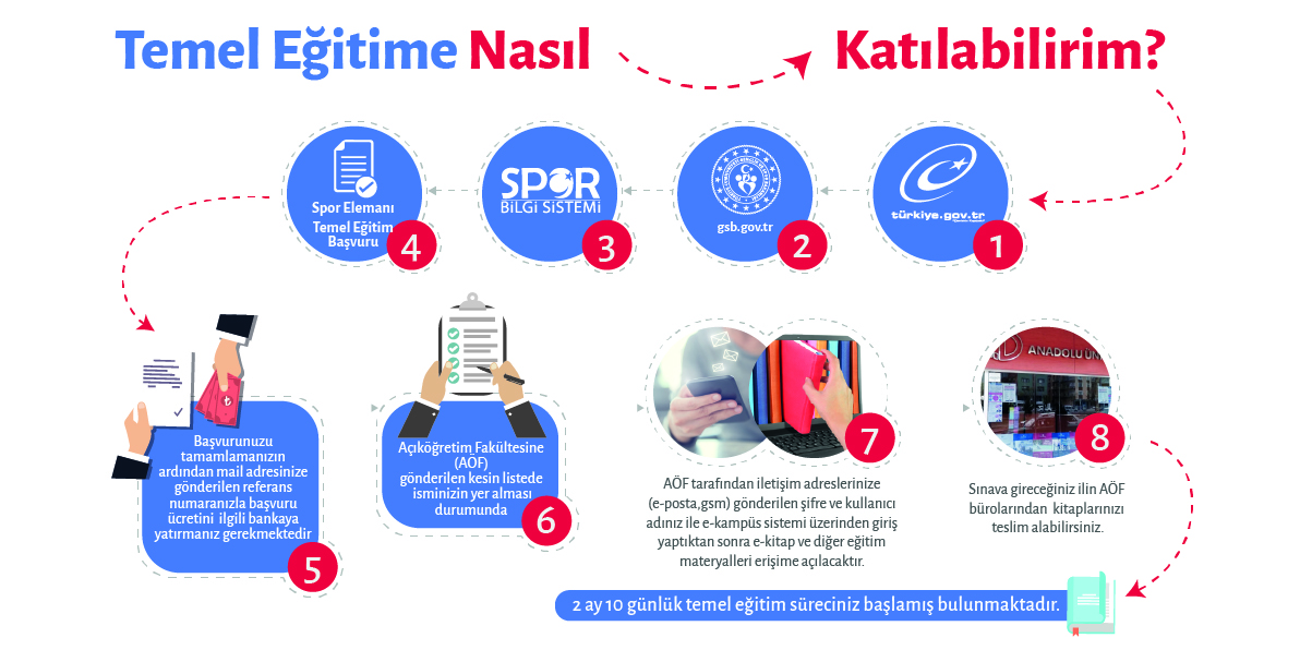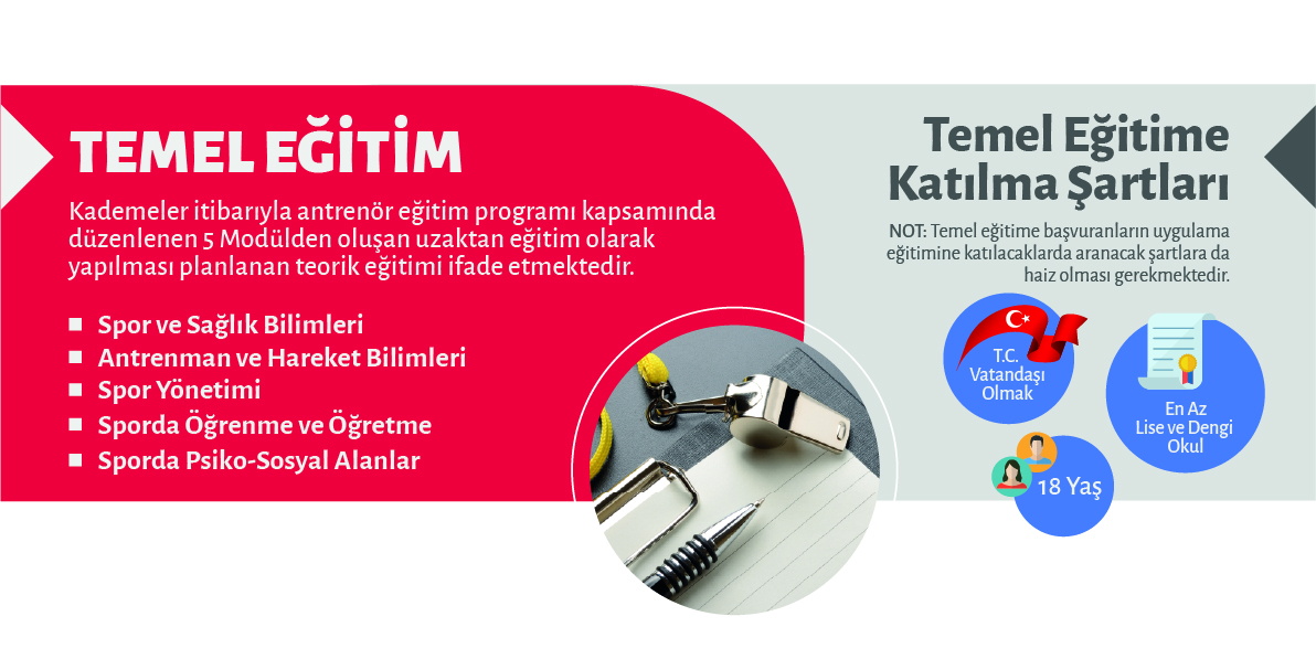 Temel Eğitim uzaktan eğitim modeli ile Anadolu Üniversitesi ile imzalanan protokol kapsamında Açıköğretim Fakültesi bünyesinde yürütülecektir. Temel Eğitimi ve Sınavı 90 gün olarak planlanmış olup 10 gün başvuru-2 ay 10 gün eğitim–10 gün sınav ve değerlendirme süreci olarak belirlenmiştir.  Antrenörlük mesleğine adım atmak isteyenlerin ve mevcut antrenör belgesinin kademesini yükseltmek isteyenlerden muafiyet hakkı bulunmayanların Temel Eğitim başvuruları 26 Ağustos-06 Eylül 2020 tarihleri arasında e-Devlet Kapısı-GSB-Spor Bilgi Sistemi üzerinden gerçekleştirilecektir.  Temel Eğitimde başarılı olan adaylar ilgili federasyonca açılacak olan uygulama eğitimine katılacak olup uygulama eğitimi ve sınavında başarılı olmaları halinde antrenör belgelerini alabileceklerdir.